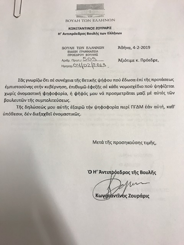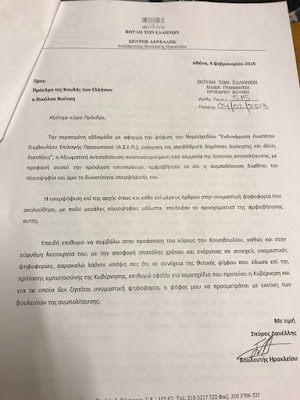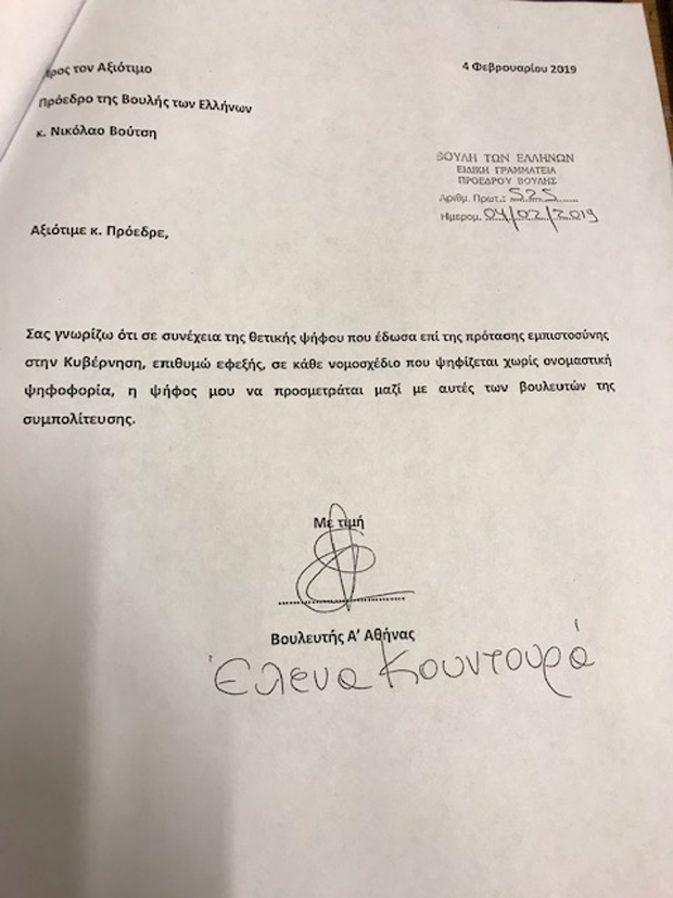 Με επιστολή τους στον Πρόεδρο της Βουλής, το περιεχόμενο της οποίας δημοσιοποιήθηκε κατά την έναρξη της χθεσινής συνεδρίασης της Ολομέλειας, οι έξι ανεξάρτητοι βουλευτές, οι οποίοι ψήφισαν θετικά κατά τη διαδικασία παροχής ψήφου εμπιστοσύνης της κυβέρνησης, στηρίζοντας το ξεπούλημα της Μακεδονίας, δηλώνουν ότι επιζητούν να προσμετράται στο εξής η θετική τους ψήφος σε εκείνες του ΣΥΡΙΖΑ, σε όλα τα νομοσχέδια, ώστε να διασφαλίζεται -όπως λένε- η δεδηλωμένη για την κυβερνώσα πλειοψηφία.
